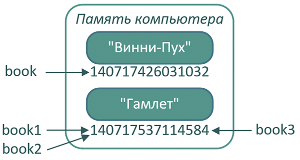Здесь book1, book2 и book3 – это просто три разных имени, указывающих на одну и ту же область памяти, где хранится строка "Гамлет".