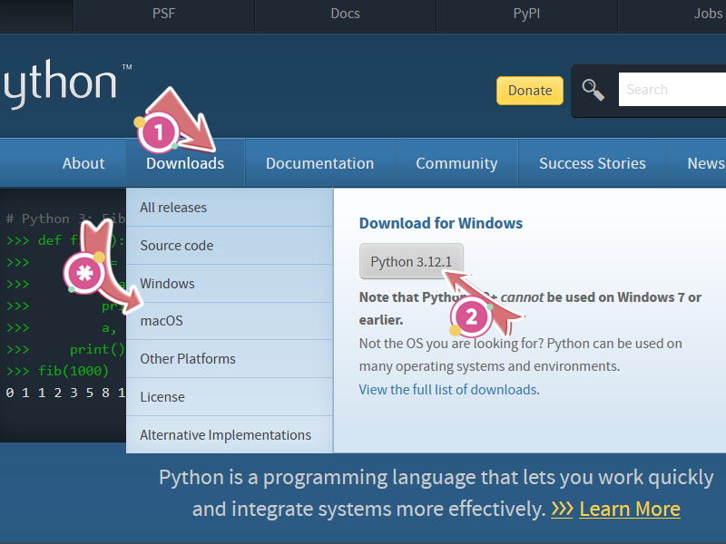 На главной странице найдите вкладку Downloads и нажмите на кнопку с названием последней версии Python 3 (например, Python 3.12.1). Начнется загрузка установочного файла. Если вам нужна другая версия Python, рядом с кнопкой загрузки вы найдете ссылки для перехода на страницы с версиями для разных операционных систем.